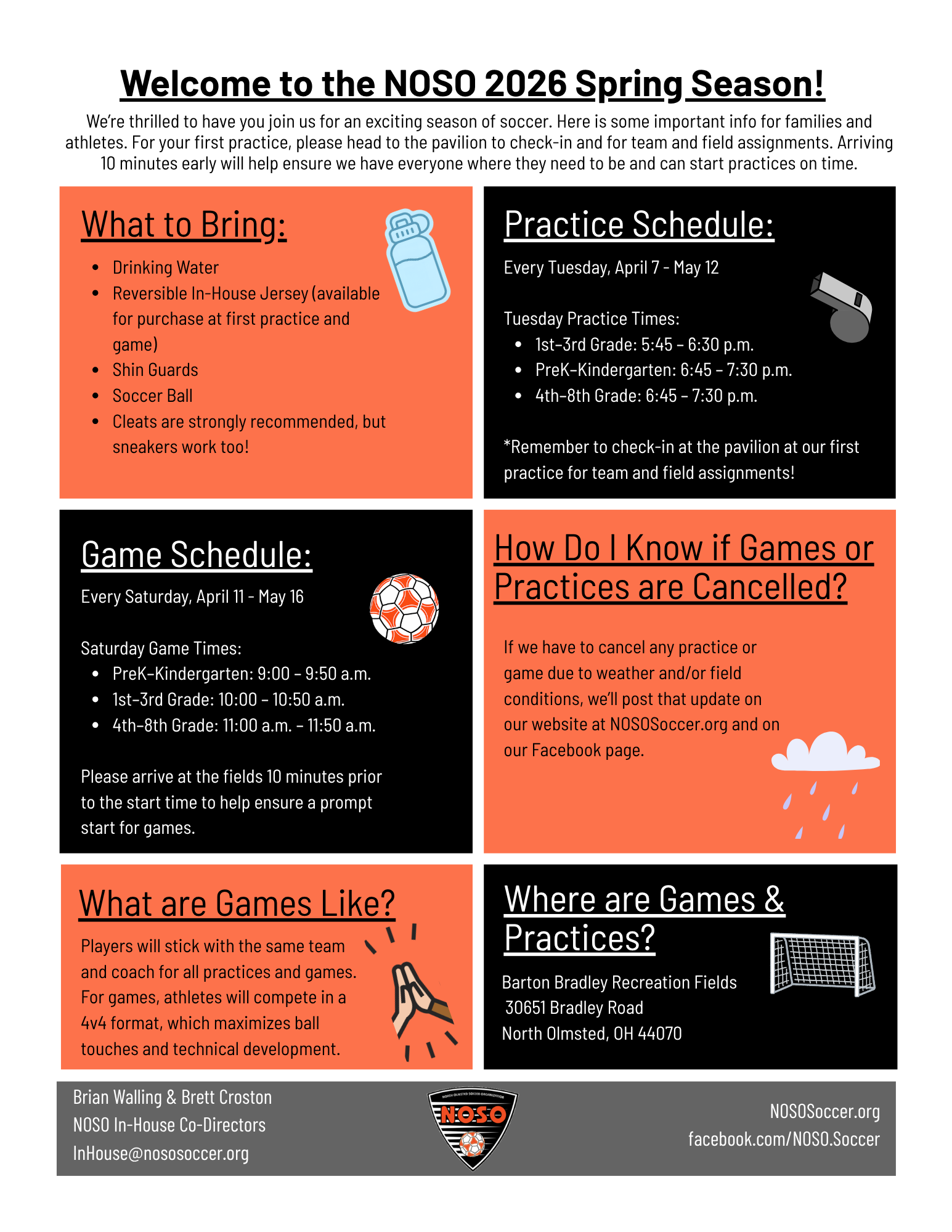 All session updates, including weather cancellations, will be posted on the NOSO website and the NOSO Facebook page rather than sent via email.